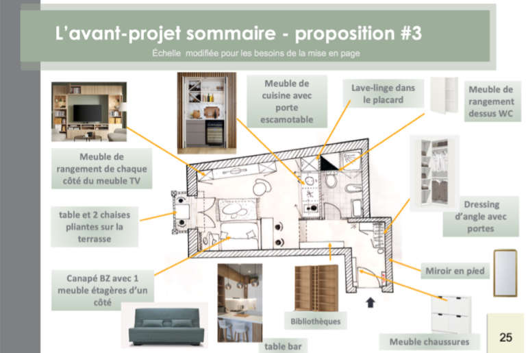Je vous propose 2/3 propositions d'implantation au sol avec les plans 2D à l'échelle 1/50 ème.